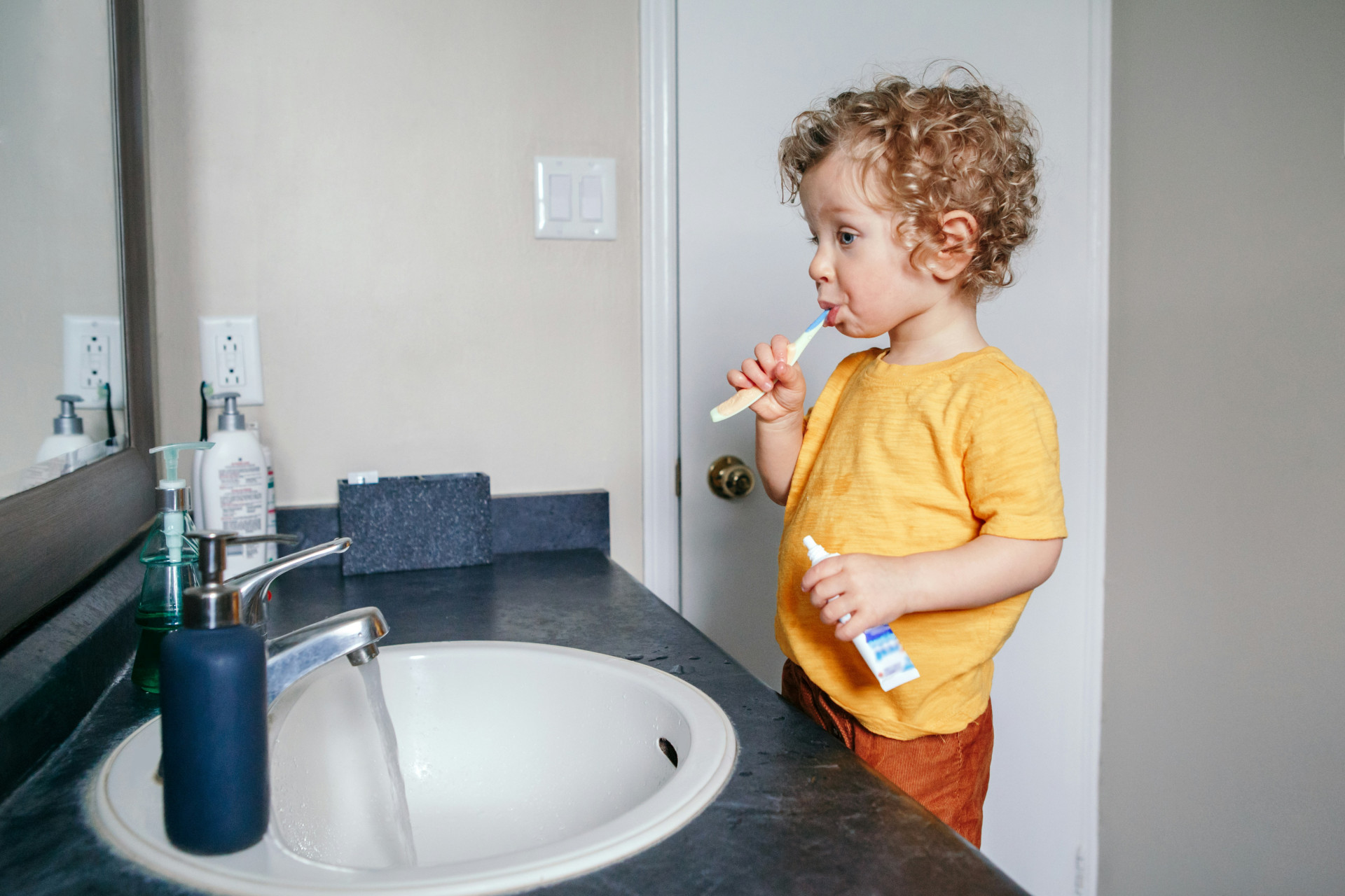 Nej – det er faktisk bedst, hvis barnet ikke skyller munden efter tandbørstning. Når tandpastaen bliver siddende i munden, får fluoriden længere tid til at virke og beskytte tænderne. Du kan i stedet bede barnet om at spytte overskydende tandpasta ud.